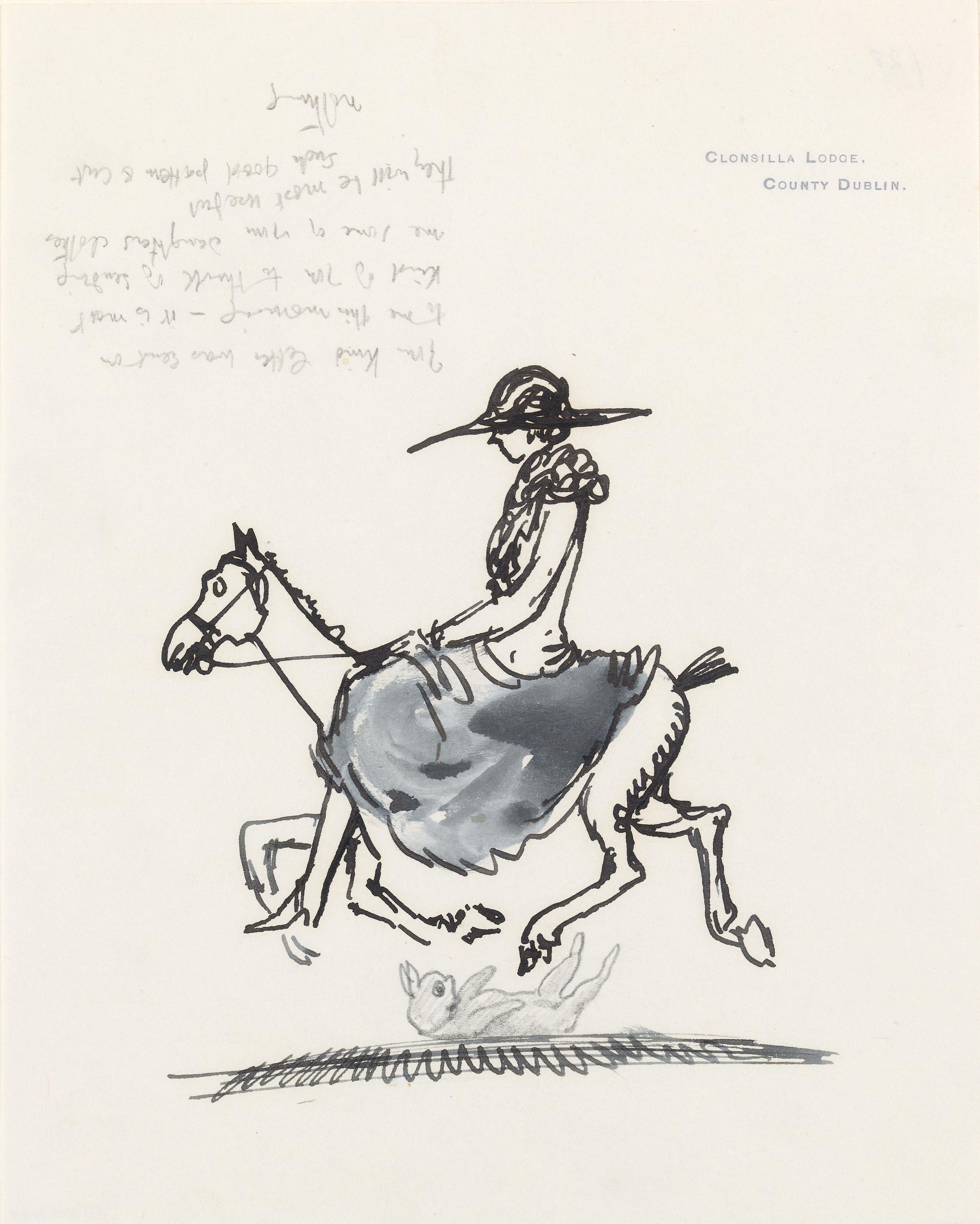 Title: Illustrated letter from William Orpen to Mrs St George with a sketch of a girl riding a horse