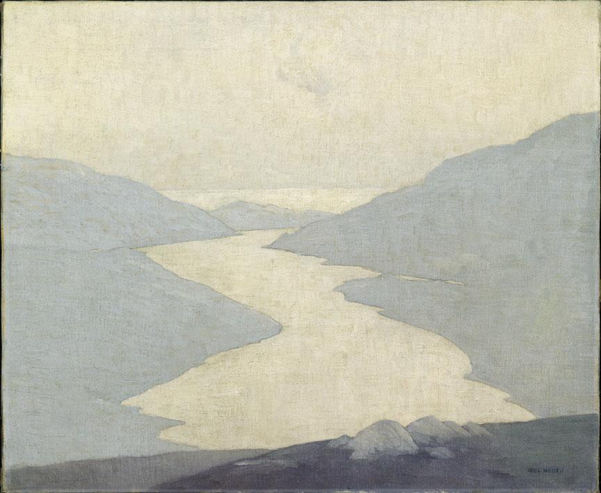 Label TextThis is one of three almost identical views by Henry of Killary Harbour, taken from a point approximately five kilometres west of Leenane. Painted shortly after Henry left Achill, his base since 1910, it represents a sophisticated exercise in abstracted landscape painting, based on the arrangement of simple, bold forms. More emblematic, perhaps, than topographically accurate, it celebrates physical and atmospheric qualities associated with the western seaboard. Such paintings, characterised by an almost monochrome palette, mark a turning point in Henry’s career, and are among the last to point directly to the influence of Whistler and Japanese art.