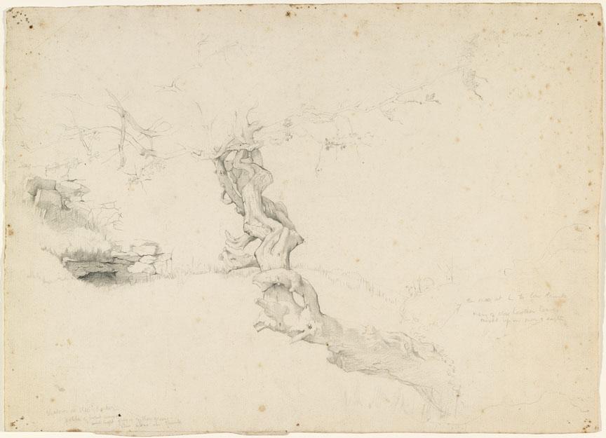 Inscriptionlower left: shadows on tree/ darker patches of burn sienna light grey and yellow green also moss on Trunk;