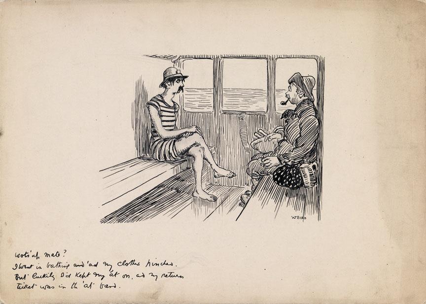 Inscriptionlower left (under illustration, in ink): Wot's up mate? I went in bathing and 'ad my clothes pinched. But luckily I'd kept my 'at on, and my return ticket was in the 'at band.