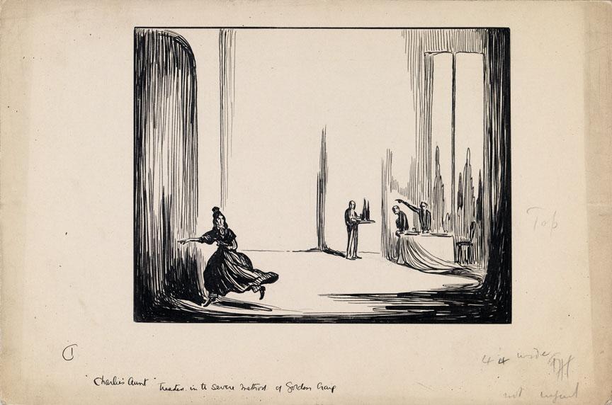 Inscriptionunder illustration (in ink, with caption): 1) "Charlie's Aunt" treated in severe method of Gordon Craig