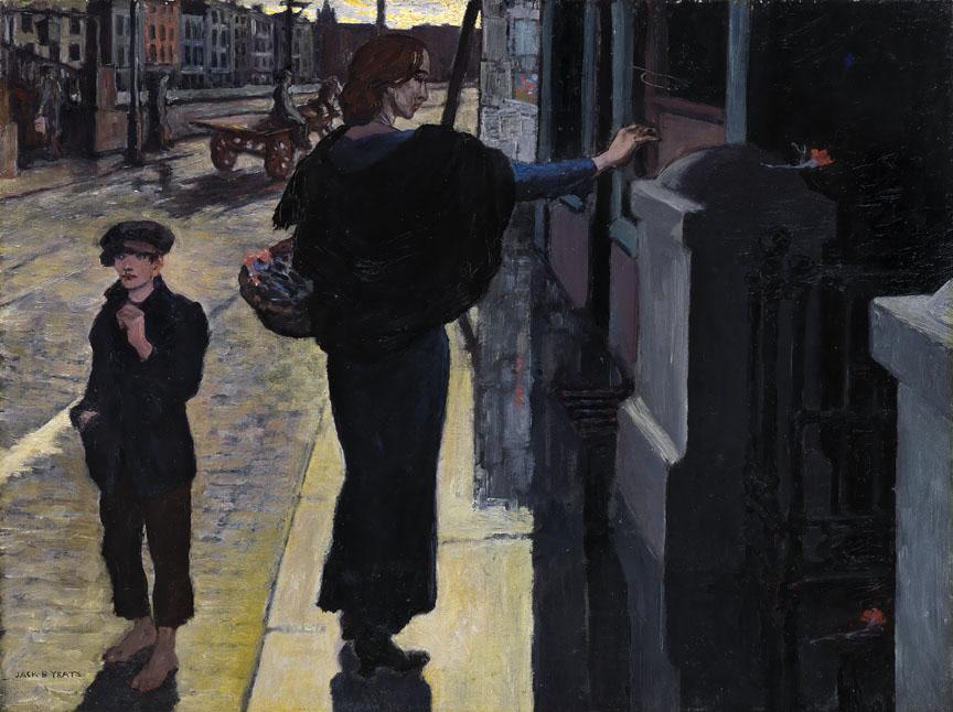 Label TextOn 26 July 1914, a detachment of the King’s Own Scottish Borderers, which had intercepted a party of Irish Volunteers transporting arms from Howth, encountered a hostile crowd in central Dublin. In panic, the soldiers opened fire, killing three people, and injuring over thirty (one of whom died subsequently). Though Yeats did not witness the event, it evidently played on his mind, as he executed a sketch on the spot the following day, and produced subsequently both this oil painting and a print on the subject.