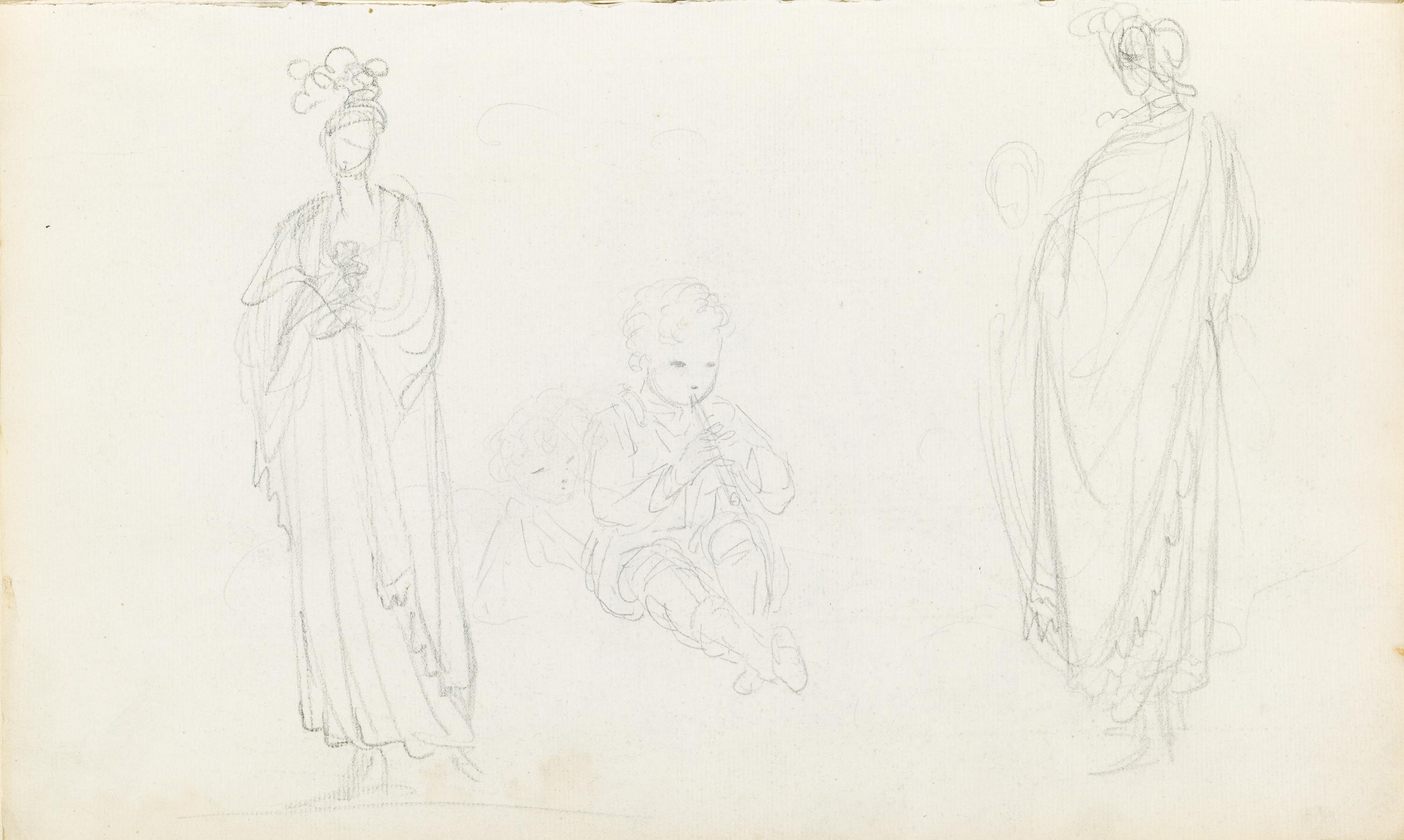 Title: Sketch of a Child Playing a Flute; Woman in Grecian Robes