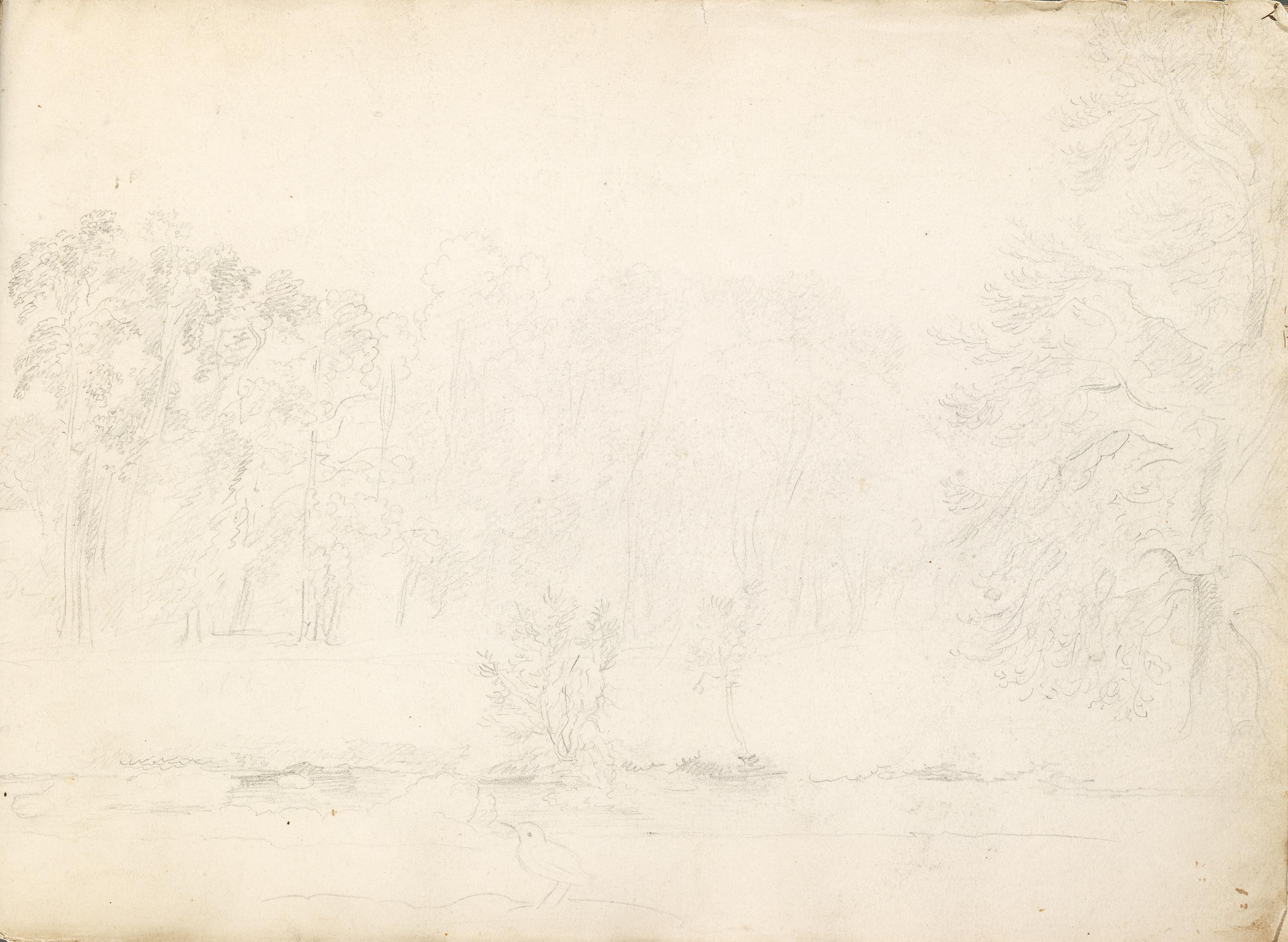 Title: Trees by a River with Bird in Foreground