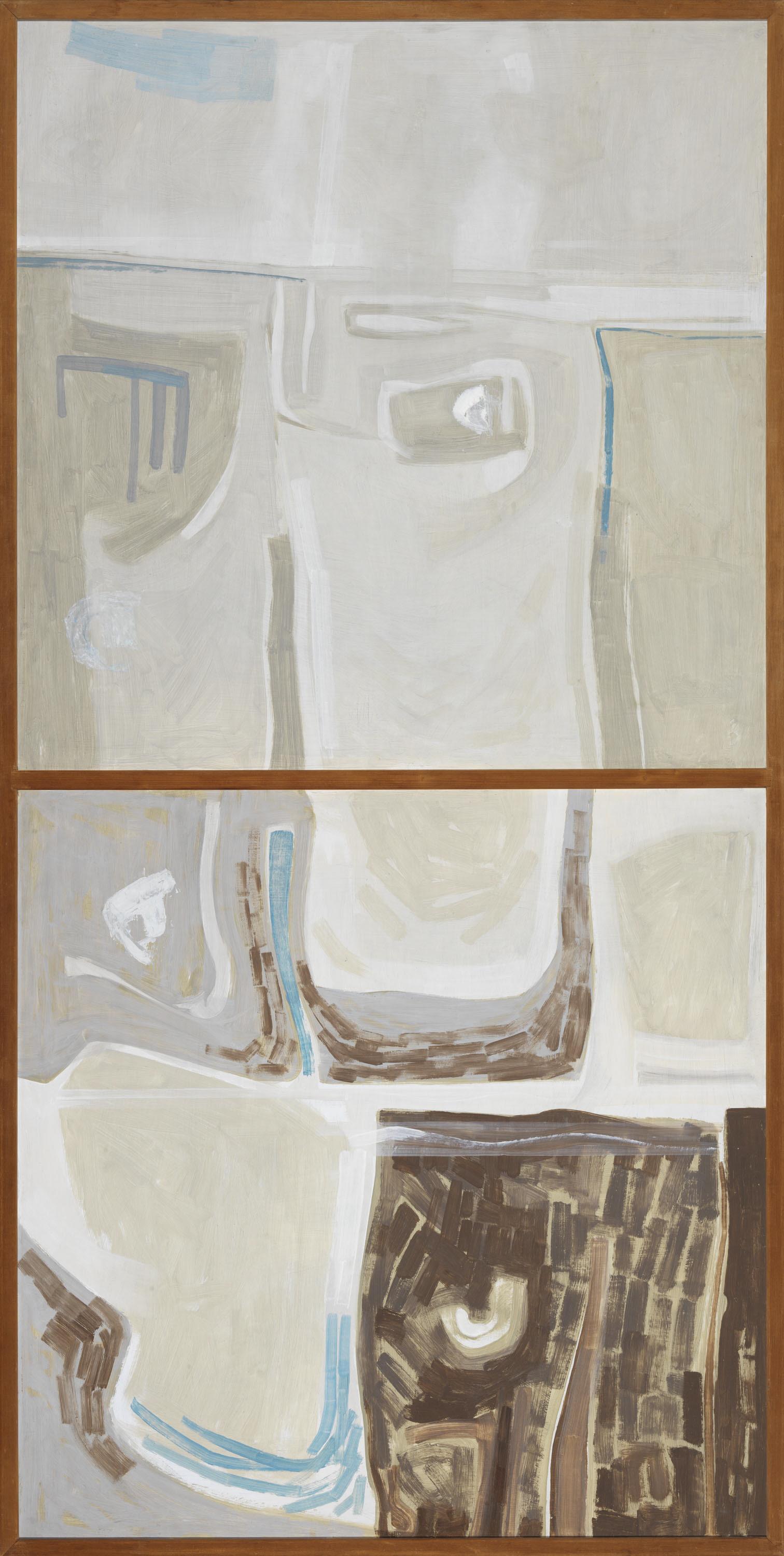 DescriptionThe origins of this painting are to be found in a visit by the Flanagans and Seamus Heaney’s family to Gortahawk, Co. Donegal, in 1964. During their holiday there, Flanagan sketched local motifs for paintings, while Heaney jotted down ideas for poems, many of which featured subsequently in his collection Door into the Dark (1969). The exhibition of paintings that resulted from Flanagan’s trip included a work entitled Boglands (for Seamus Heaney). Heaney reciprocated the gesture by penning the poem Bogland: for T.P. Flanagan. Boglands 4, a vertical diptych that dates from Flanagan’s return to Donegal in 1968, resembles the earlier painting, but is more abstract in character. Its orientation allows the artist to address the constituent elements and layers of the bog, and adjust his palette from top to bottom. ‘As an artist, he has gone his own way’ Heaney wrote of Flanagan in 1995, ‘explored the Irish landscape and enhanced Irish landscape painting through the discovery and elaboration of an individual style’.