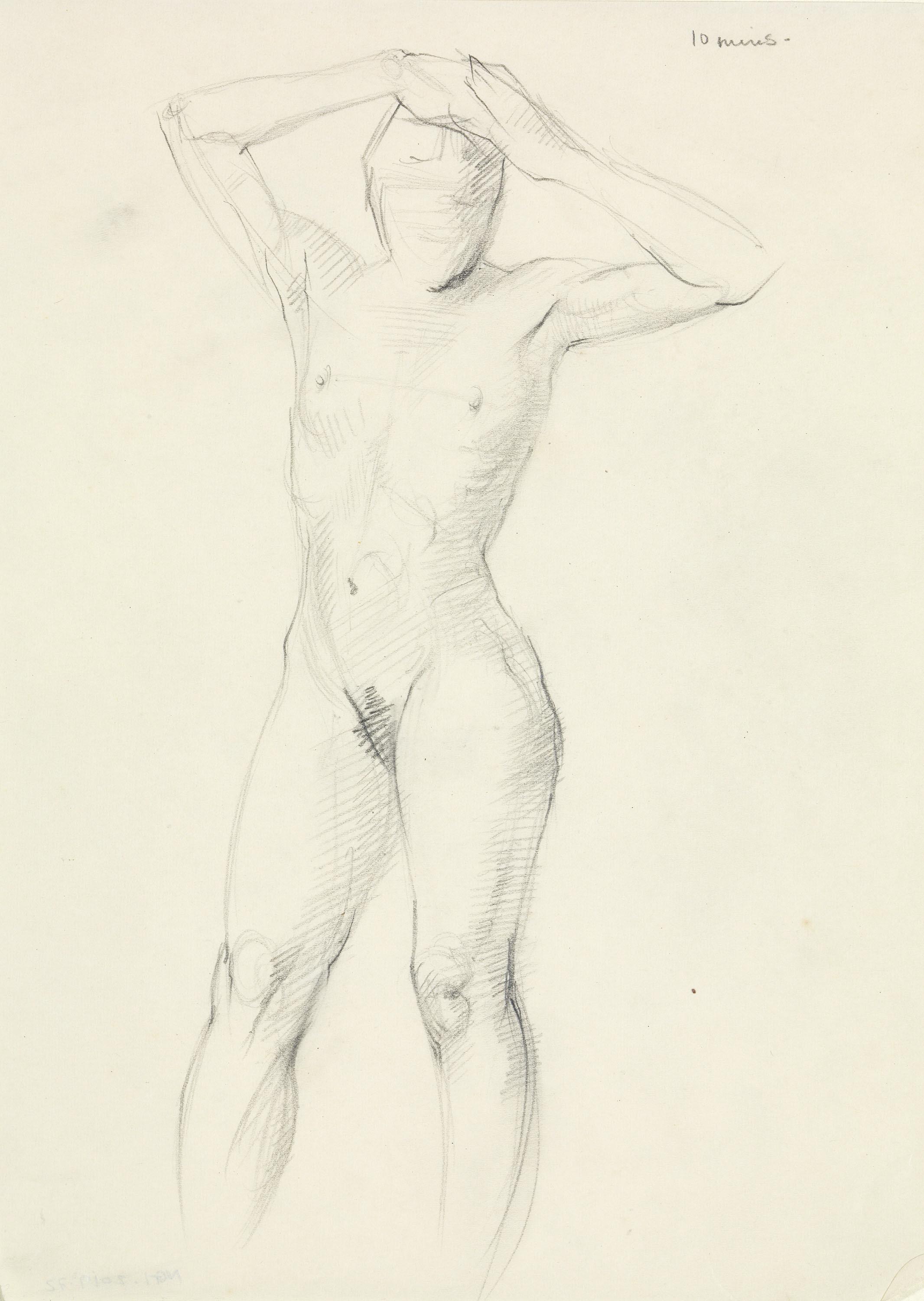 This representative collection of study material forms part of the Prints and Drawings collection. The group of works (ngi.2019.68-88) comprise figure drawings, produced during the artist’s time as a student of the Metropolitan School of Art, with many inscribed 1933, 1934 and 1937, along with a gouache of Ventry Bay, dated 1939, together with two later sketchbooks, dated 1969 and 1973. These enhance the collection of four sketchbooks by the artist, dated c.1931-34, acquired by the National Gallery of Ireland in 2018. This selection of works on paper forms part of a larger body of work, including figure drawings, poster and textile designs, gifted by the artist’s family to the NGI Library and Archive collections. This generous gift gives researchers a greater insight into the artist’s student work, along with the various strands of her output. The acquisition also enhances the work of Irish women artists within the collection.