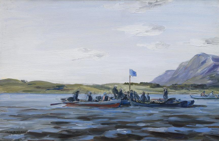 Label TextThis picture was among several inspired by a visit Yeats made in 1923 to Lady Gregory at Coole Park in Co. Galway. In tone and activity, it contrasts with Yeats’s animated, rain-swept illustration Regatta, included in his book Life in the West of Ireland published in 1912. In this painting, Yeats records boats assembling for the start of a race on Lough Cultra, near Gort. The description of the event is at once economical and bold, featuring carefully observed local detail, and a horizontal composition interrupted by a flag pole.