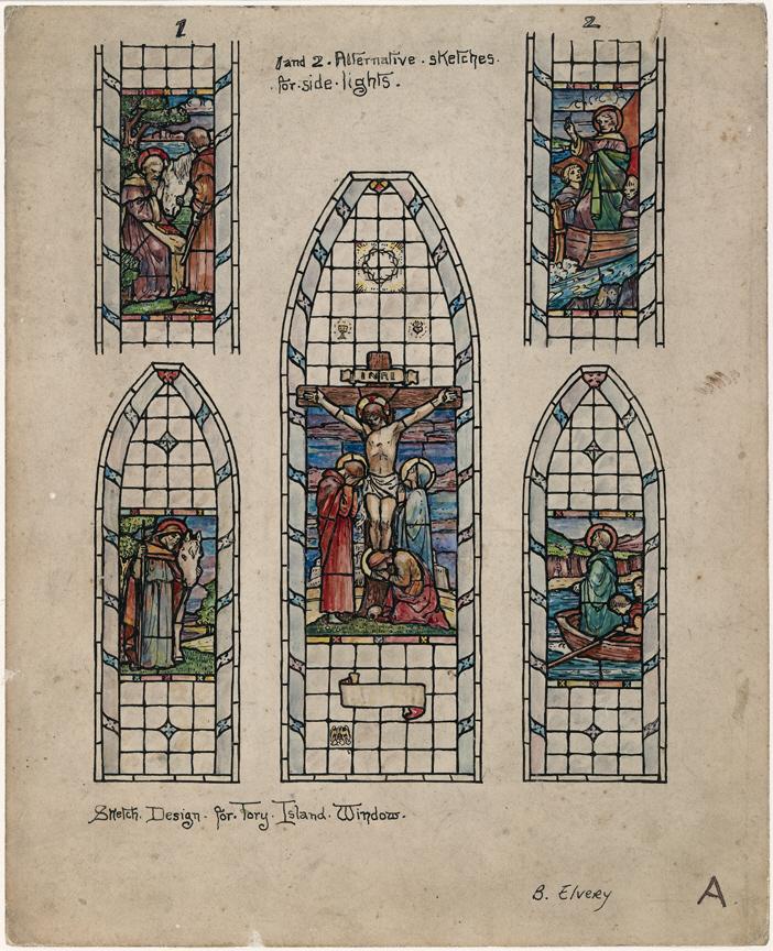 Title: Saint Columba with the White Horse that Foretold his Death, the Crucifixion and Saint Columba Arriving at Tory Island