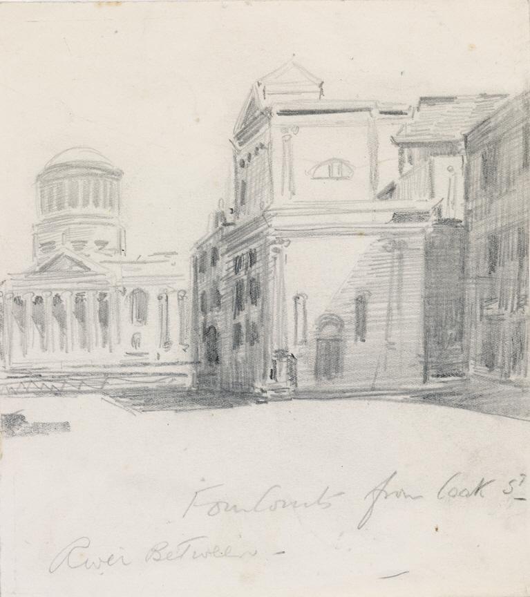 Title: The Four Courts from outside the Church of Adam and Eve and the Immaculate Conception; Leinster House from Molesworth Street (on verso)