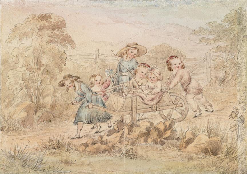 Title: Wheelbarrow Containing Six Children: Phillipa Leicester, Fanny Joanna, Caroline Margaret, Fitzroy William, Lincoln Edwin and Charles Augustus Stanhope, later 8th Earl of Harrington