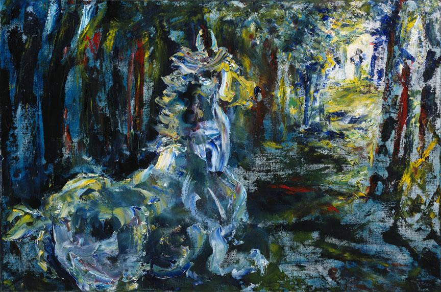 Label TextYeats displayed a great affection for horses throughout his career. Horses feature prominently in his work, from his earliest watercolours of life in the west of Ireland to his later, more esoteric paintings. In this picture, a spectral horse gallops from the shadows of a wood towards a bright, distant opening, in which a figure in silhouette stands waiting. Skilfully foreshortened, the horse embodies freedom of movement, expressive energy and positive intent. An optimistic painting, it can be read as an allegory of life.