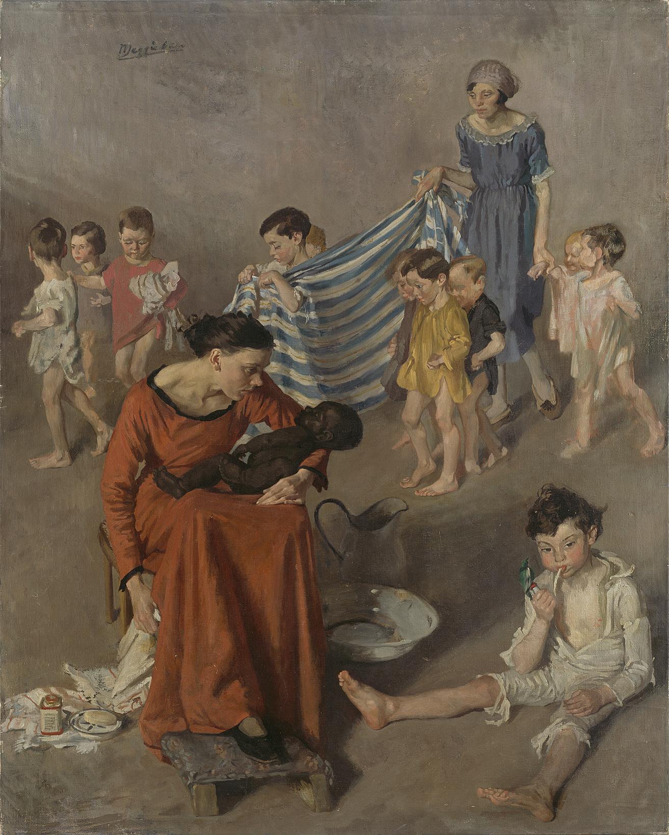 Label TextInspired by a family holiday in Laytown, Co. Meath, this painting is at once an elaborate fiction and an intimate domestic record. Julia O’Brien, Clarke’s favourite model and nanny to her three children (who can be seen together on the left), was the model for both adult figures. The seated boy is Terry Clarke, the artist’s nephew, who also reappears in the background. Throughout the composition are items from the Clarke home. The black infant may have been inspired by a carved head of a baby that was also in the family’s possession.