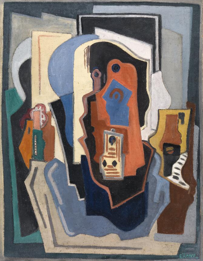 Label TextHone met Mainie Jellett in 1917 at the Westminster Art School in London. They remained life-long friends and collaborators, studying together in Paris in the early 1920s under André Lhote and Albert Gleizes. Though Hone’s paintings often resembled Jellett’s formally, the artist herself was not as committed to Cubism as her compatriot, and did not concern herself particularly with theoretical principles. Her painting did, however, inform her stained glass work, to which she committed herself principally from the early 1930s.