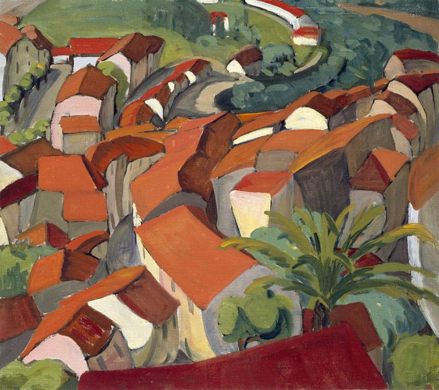 Label TextAfter the First World War, Swanzy visited Czechoslovakia and Yugoslavia where her sister was involved in relief work. During this time, she made sketches and paintings of landscapes and village life. In this picture, Swanzy explores the patterns made by brightly coloured rooftops from a high vantage point. The curving lines of the buildings convey a sense of rhythm and movement, which relates to the artist’s longstanding interest in Futurism and Vorticism. By limiting her palette to red, green, and white, Swanzy emphasises abstract forms and repeated patterns.