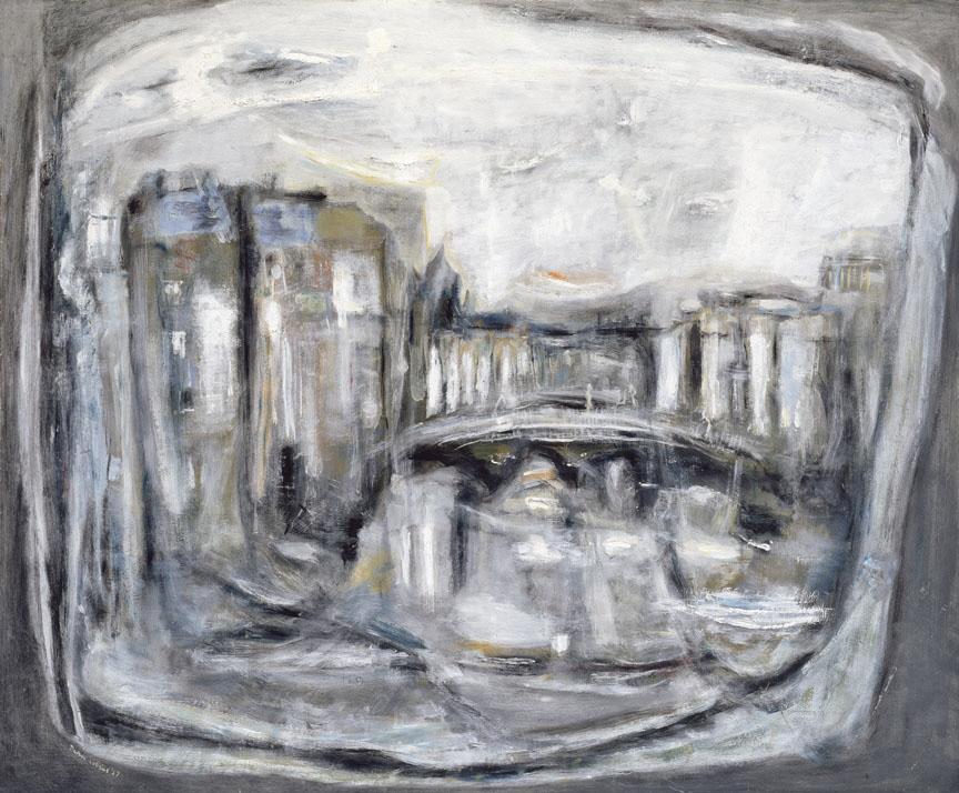 Label TextThis is a recollection of the city, ‘blurred and altered by time’, spared of distracting architectural detail and apparently devoid of human activity. The Ha’penny Bridge, recognisable at the centre of the composition, serves to orientate the viewer, while the grey palette suggests at once the limestone and granite fabric of the city, overcast skies, and perhaps the neutral colours of distant memory.