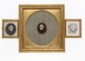 DescriptionThe centrepiece of this unusual grouping of portraits is a delicately painted miniature by Nathaniel Hone. The sitter is James Turner, a well known London character, who charged artists a shilling per hour for posing. A specially made gilded frame contains two further frames which slide out to reveal miniature portrait prints. The engraving on the left was made by Captain William Baillie in 1774. Hone, an avid collector of drawings and prints, produced a number of accomplished mezzotint prints. However, he seems to have been rather less skilled in the etching technique as demonstrated by the rough print on the right.