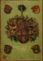 The style of Faber’s landscapes suggests that he had first-hand knowledge of Flemish paintings, landscapes that filled the entire background being a frequent feature of Flemish portraits at this date. Katherina is represented almost three-quarter-length, dressed in a brightly coloured outfit that is sumptuously decorated with gold embroidery and jewellery, reflecting her aristocratic status. The reverse of the panel also carries a painted coat of arms of the Knoblauch family, which features three cloves of garlic (knoblauch in German).
